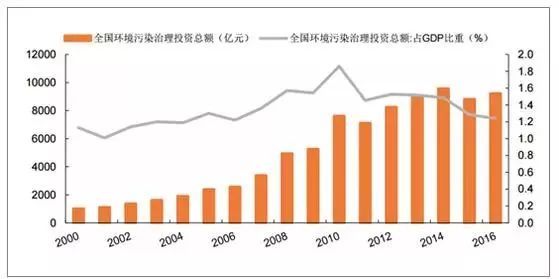 復合增速達14.79%。2016年,我國環境治理投資占GDP比例為1.24%。根據國際經驗,當治理環境污染的投資占GDP的比例達1%~1.5%時,可